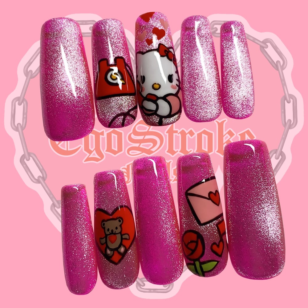 ‘CALLIN U BACK’ is a press-on set is a long length square with a pink cat eye base with hand-painted Hello Kitty details. This set encompasses a nostalgic, sweet romantic vibe!