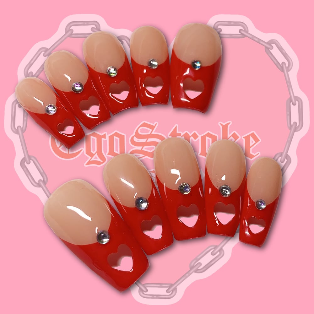‘MA CHÉRIE’ is a press-on set is a medium size, medium length square set with a classic red French tip, dainty gem detailing, and heart-shaped cut outs. She is a classy, MATERIAL GWORL vibe for Valentine’s Day!